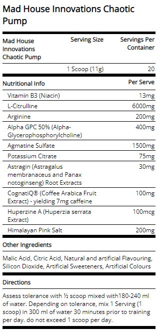 Mad House CHAOTIC PUMP Nitric Oxide Booster Blue Raz flavour 20 serves